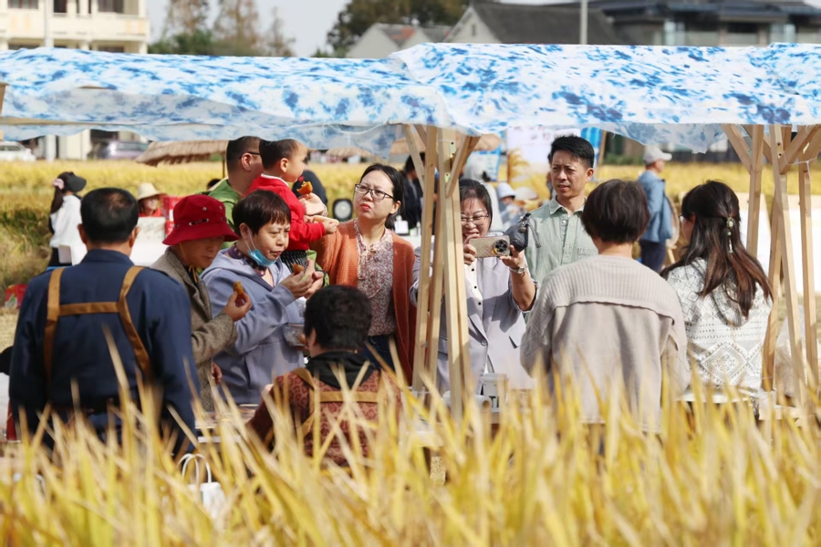 田埂上,小朋友们架起画架,用手中的彩笔画出丰收的景象。“稻香煮韵” 区域,搭配农户手工制作的米糕,市民在天幕下围炉品茗,畅谈农时趣事。