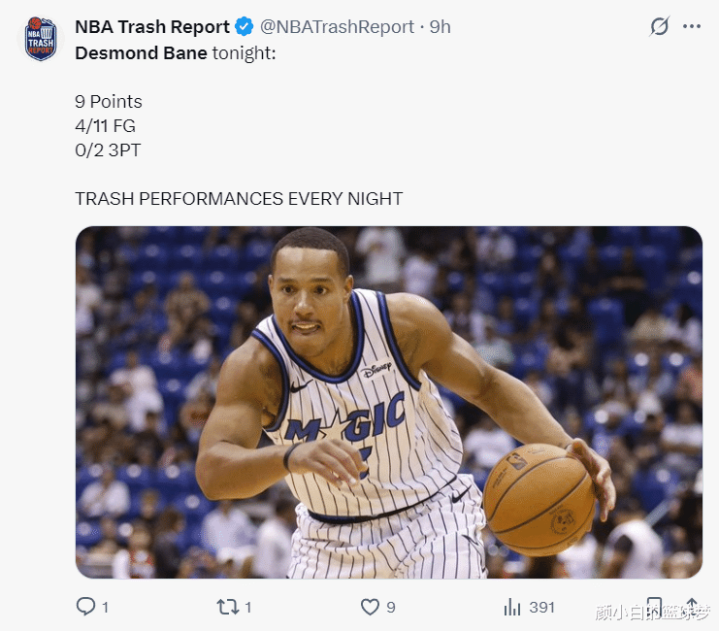 就算魔术击败黄蜂结束了四连败,但贝恩的表现也很拉胯,全场比赛28分钟,11中4,三分2中0,仅拿9分7助攻4篮板4失误,命中率36.4%。上一场对阵活塞他是15中4+三分4中1,各种拉胯令人无奈。